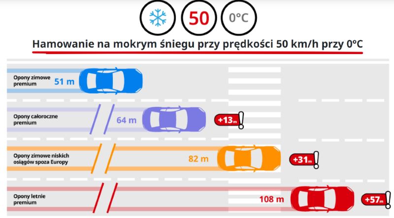 Badania porównawcze opon całorocznych i zimowych, klasy budżetowej i opon niskich osiągów – przeprowadzone we współpracy z Polskim Związkiem Przemysłu Oponiarskiego (PZPO), Politechniką Rzeszowską oraz firmą rzeczoznawczą Auto-Test – wykazały, że samochód na oponach zimowych budżetowych sprawdzonych producentów zahamował po 28,5 metra, podczas gdy w takich samych warunkach opony niskich osiągów potrzebowały aż 38,5 metra, czyli 10 metrów dalej!